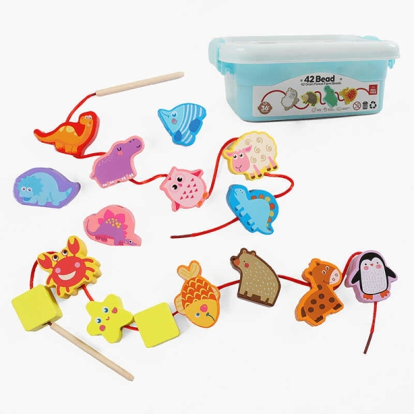 Дерев’яна шнурівка С 74439 (36) 42 фігурки тварин, декілька шнурків з дерев’яним краєм, в боксі