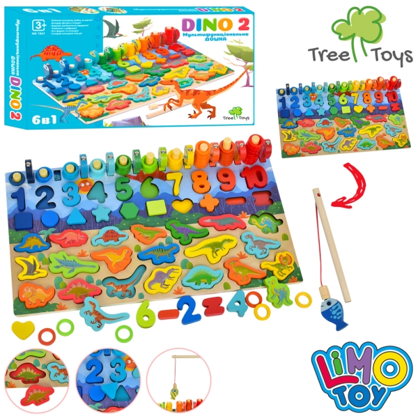 Дерев'яна мультифункціональна дошка Dino 2 - ідеальна гра для розвитку навичок та розваги для маленьких дітей. Ця унікальна іграшка поєднує в собі шість різних функцій, які допомагають дитині розвивати різні аспекти свого інтелекту та навичок. Ось докладний опис функцій та характеристик цієї чудової іграшки: