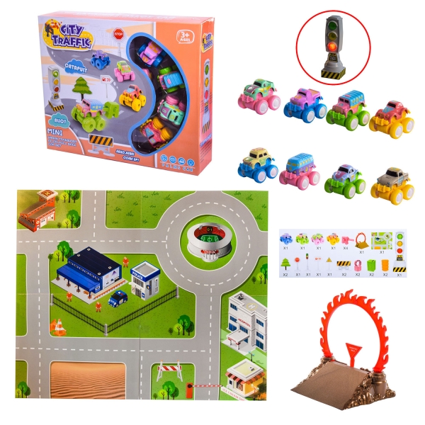 Головною особливістю цього набору є гра на яскравому полотні розміром 49 x 59 см з малюнком міського трафіку. Ваш малюк зможе розмістити машинки на ньому та проводити захоплюючі гонки або вивчати правила дорожнього руху.