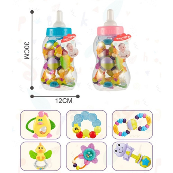 Брязкальце 5607, набір з 6 шт: від 11см, 4шт з прорізувачами, доступні в 2 кольорах, у колбі-пляшечці (розміром 30x12 см)