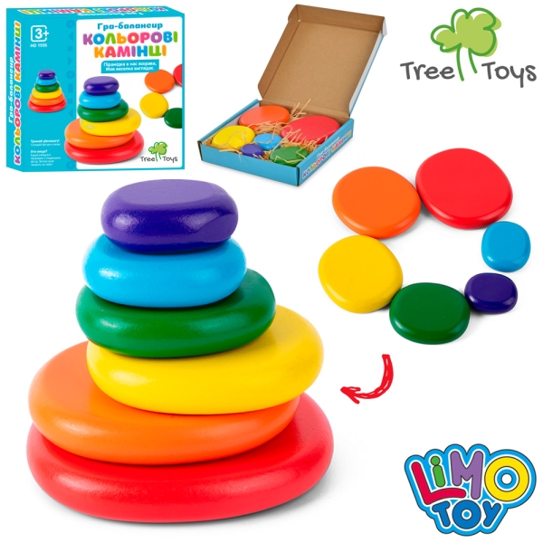 Набір складається з 6 кольорових каменів різних розмірів та форм, які можна використовувати для створення різних комбінацій та пірамід. Камені зроблені з натурального дерева та оброблені спеціальним чином, щоб вони були гладкими та приємними на дотик.