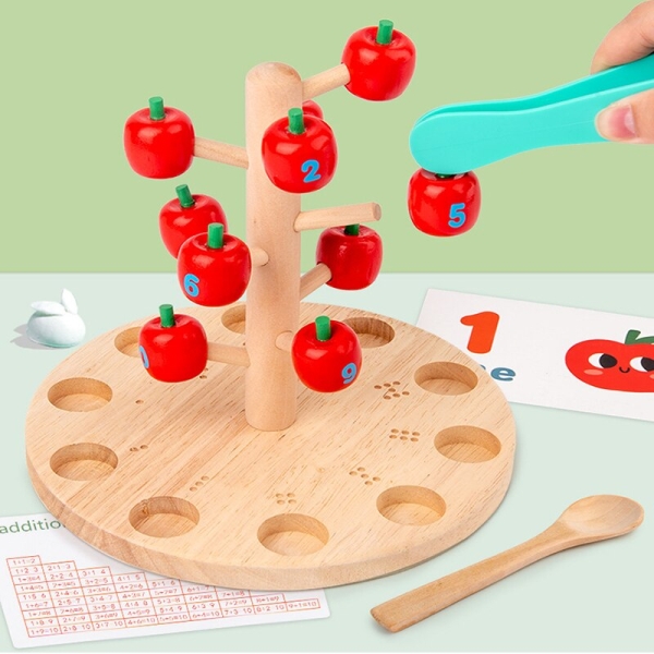 Дерево зроблено з натурального дерева, що робить його екологічно чистим та безпечним для дітей. Яблука пронумеровані, що допоможе вашій дитині вивчити числа та рахунок до 10. Пінцет та ложка допоможуть розвивати дрібну моторику рук, а також покращити координацію рухів.