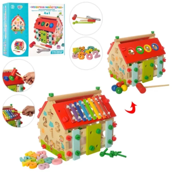 Ця іграшка пропонує безліч варіантів гри та навчання для дітей. Можливість використовувати будиночок як конструктор дозволяє дітям розвивати свою креативність та уяву, а також покращувати дрібну моторику та координацію рухів. Ксилофон і стукачка додають музичний елемент у гру та сприяють розвитку музичних здібностей. Сортер з цифрами та геометричними фігурками допомагає розвивати математичні здібності, колірне сприйняття, увагу та логіку. Інструменти в комплекті дозволяють дітям вивчати та практикувати механіку та конструкцію. В цілому, цей центр розвитку допомагає дітям весело і ефективно вивчати і розвивати безліч навичок і здібностей, що робить його прекрасним вибором для батьків, які хочуть, щоб їхні діти грали і навчалися одночасно.