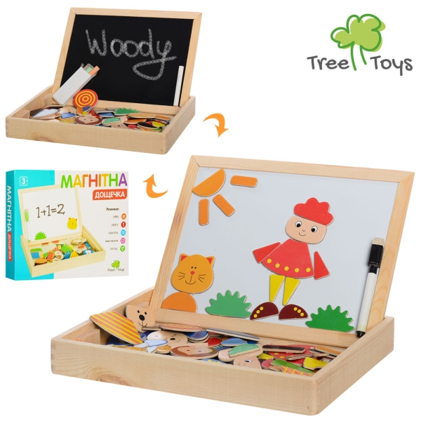 - Комплектация: двусторонняя доска, магнитные фигуры, маркер, мел, губка, деревянный лоток