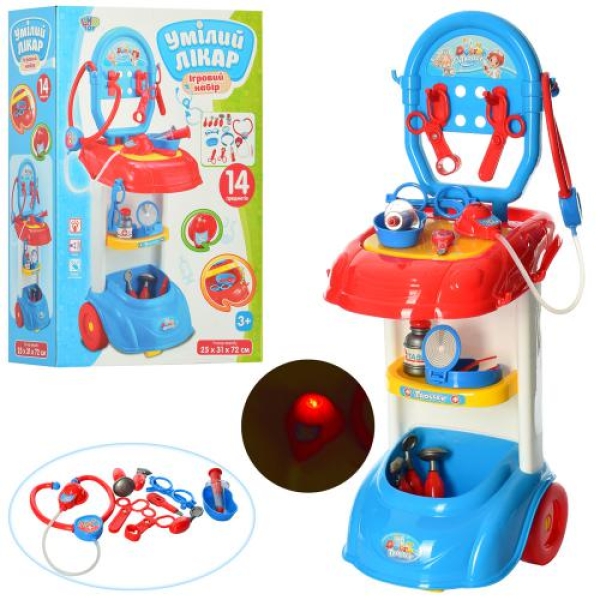 Набор Doctor Trolley очень масштабен и содержит множество необходимых любому начинающему врачу предметов! Тут есть стетоскоп, который, к слову, имеет звуковые эффекты - если нажать на кнопку, то врач услышит ритм сердца пациента! Имеется зеркало окулиста, шприц, ванночка, различные приспособления, даже склянка с пилюлями. И все это удобно размещается на практичной подставке, которую можно перевозить с места на место или непосредственно к кровати больного - она движется на больших колесах.