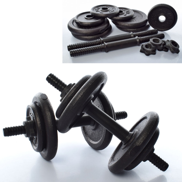 17кг (2шт по 8,5кг), складальна, 8 дисків (4 шт-1кг, 4шт-3кг, метал, посадковий діам.28мм), гриф 2шт (діам.24мм, длина 35см, метал покритий пластиком), 4 гайки (пластик ) , чорний