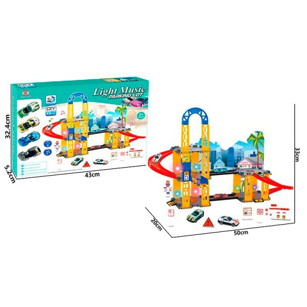 Гараж 0908-70A: Розмір 50x33x20см, Машинка 4шт, Звук та Світло на Батарейках в Коробці (43x32.4x5см)