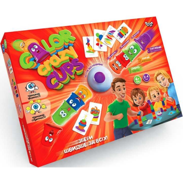 «Color Crazy Cups» - це інтуїтивно зрозумілі правила, яскраве оформлення гри, великий набір кольорових ковпачків і обмеження в часі! Нескладна, але дуже цікава настільна гра захопить з першої секунди раунду. Необхідно зібрати стаканчики відповідно до завдання, яке зображено на картці! Ніхто не встигне занудьгувати, тому що збирати треба на час, швидше за всіх! Сполучення декількох кольорів і різноманітних форм послужать хорошим тренуванням мислення і швидкості реакції. Для самих маленьких підійде варіант вивчення кольорів, форм і їх відповідників, для старших цікавим розвагою стане змагання на швидкість.