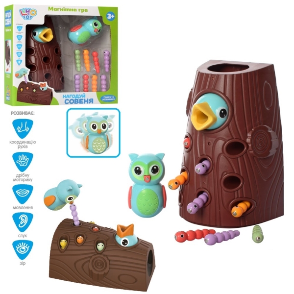 - Магнитная "птичка-дятел": Магнитная палочка выполнена в виде симпатичного совенка. Ребенок достает червячка из ствола дерева (имитируя действия дятла – лесного доктора) и переносит его к птенцу в клюв.