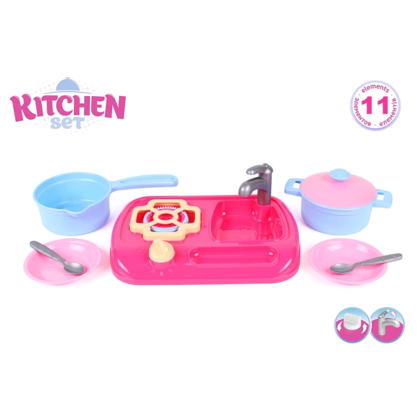 В наборе: столешница кухонная, кран, кастрюля, сотейник, крышка, ложки, вилки и тарелки по 2 шт. Игрушка для детей от 3-х лет.