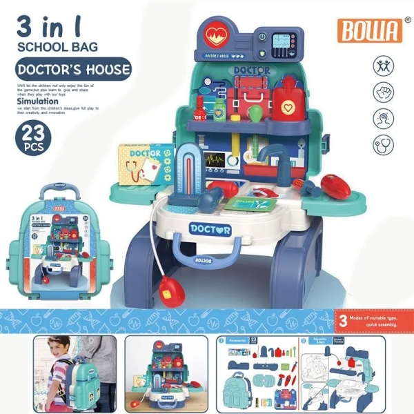 Различные реквизиты и игрушки: Этот набор включает в себя различные инструменты и аксессуары, которые ребенок может использовать для лечения своих пациентов. Это может включать стетоскоп, шприц, пинцет, лекарственную карту, и многие другие детали.