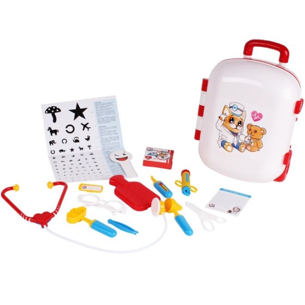 В наборе есть: стетоскоп, молоточек, градусник, шприц, ножницы, грелка, пинцет, лист для выписки рецептов, игрушечная упаковка таблеток, «лекарственные» очки и даже специальная таблица для проверки зрения.