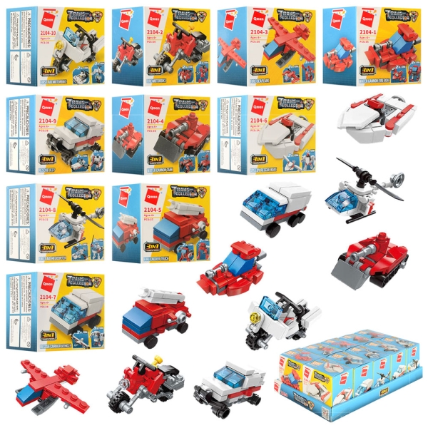 Конструктор Qman 2104 3в1, транспорт, від 30 деталей, в корці, 10 шт (10 видів) в дисплеї, 15,5-7,5-24,5см