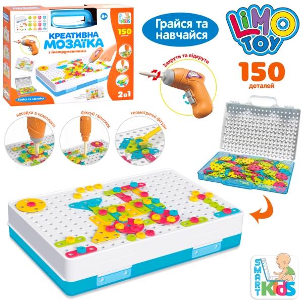В акуратну валізку поміщається все необхідне для веселої гри: 150 різнокольорових деталей, включаючи шурупи, викрутку та шуруповерт. Одна зі стінок валізки - ґратчаста основа, на якій дитина відтворює схеми фігурок і вигадує власні об'єкти. Вони можуть бути як плоскими, і тривимірними! Шуруповерт на батарейках допоможе маленькому генію легко та швидко скріпити фрагменти між собою. Іграшка дуже мобільна - всі предмети складаються всередину кейсу, і малюк може взяти набір із собою як на прогулянку, так і в подорож, на дачу або у відпустку.