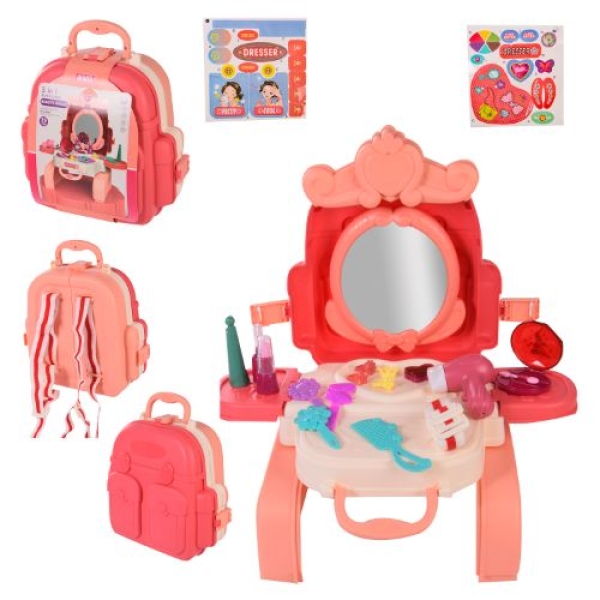 Кожна маленька принцеса мріє про свій куточок, де вона зможе наводити красу собі та своїм лялькам. У розібраному вигляді іграшка є справжнім туалетним столиком з дзеркалом, і набором аксесуарів. Трюмо компактно збирається в рюкзак, який маля зможе носити з собою.