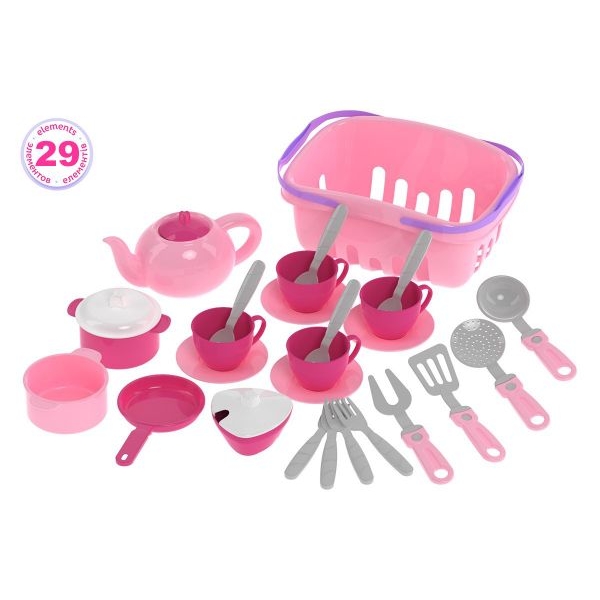 У наборі є все необхідне для приготування смачних страв та зустрічі гостей. Дві каструльки та сковорідка для втілення різноманітних кулінарних задумів. Шумівка, черпак та лопатка зроблять процес приготування максимально реалістичним. А щоб порадувати гостей ароматним чаєм — чайник із кришкою, цукорниця, ложечки та чашки на блюдечках. Всі іграшки розміщуються в кошику з двома ручками. Так посуд можна брати із собою на прогулянку та влаштувати справжній пікнік для друзів. Вдома ж іграшки зручно зібрати у кошик і зберігати у дитячій кімнаті.
