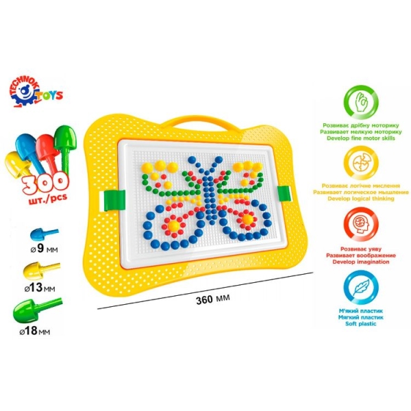 Мозаїка складається зі зручного пеналу-саквояжу з двома фіксаторами. Розміри фішок - 9 мм, 13 мм та 18 мм. Чотири кольори - 300 фішок. Рекомендується починати з картинок, запропонованих на коробці.