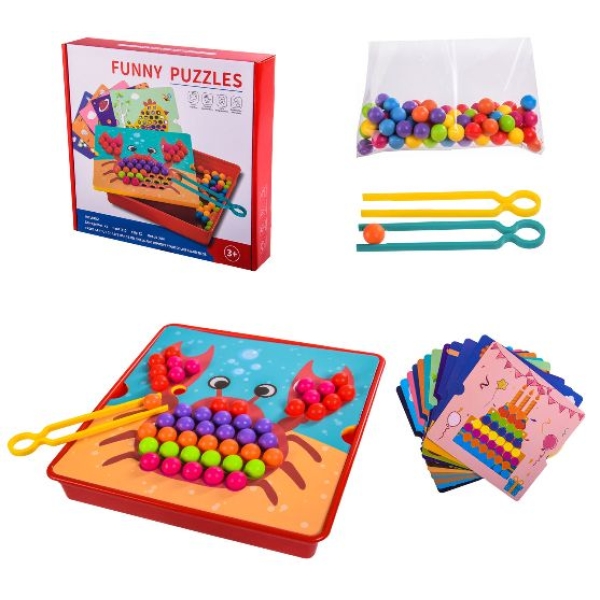 Чудова гра для розвитку малої моторики дитини. Вона дозволить створювати барвисті об'ємні композиції із великих кульок. Гра тренує спритність, проробляються дрібні рухи кисті рук і пальців, адже дитині потрібно розташувати кульки в комірках планшета.