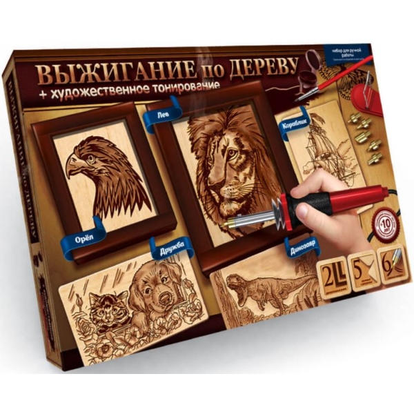 У комплект входить все необхідне для початку роботи - 5 дерев'яних заготовок з нанесеними на них картинками, які ви зможете випалити в техніці пірографії. Випалювач, який підключається до електромережі, і має змінні насадки різних форм, так що ви зможете створювати різні візерунки і малюнки.
