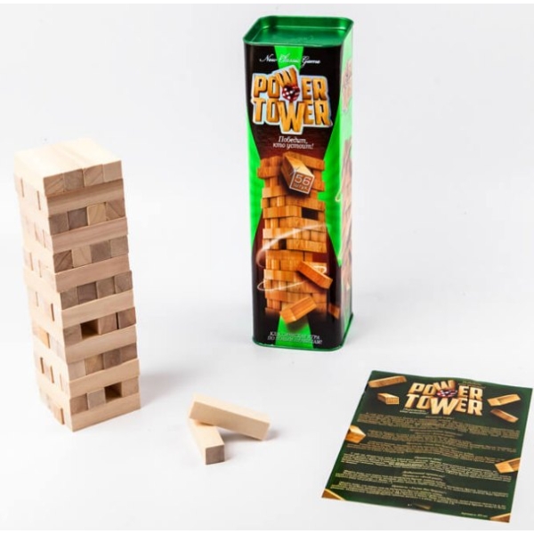 Как играть:"Power Tower" состоит из деревянных брусков, которые нужно аккуратно укладывать в башню, чередуя направления расположения. Игроки по очереди вынимают бруски из нижней части конструкции и добавляют их на верх, используя только одну руку. Цель игры - не разрушить башню! Победит тот, чье прикосновение к башне было последним, и конструкция осталась устойчивой.