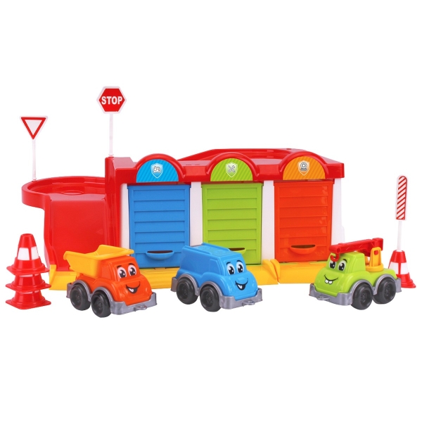 Машинки, трактори, автобуси та літаки – найбажаніші подарунки усіма дітлахами. Відразу 3 машинки біля паркінгу з великим з'їздом – це справжня знахідка. Паркінг із трьома дверима різних кольорів, імітація заправки та машинки з милими емоціями принесуть море радості дітлахам.