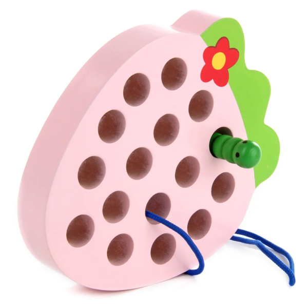 Главная цель этой игрушки – пропустить зеленого червячка через отверстия в аппетитной клубнике. Эта активность не только увлечет вашего малыша, но и поможет ему развивать моторику пальчиков, координацию движений и цветовое восприятие.