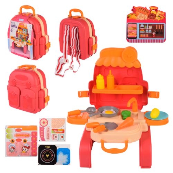 Милий рюкзак легким рухом руки перетворюється на дитячу кухню. Кухня має все, що треба для маленьких кулінарів: варильна поверхня, миття, робоча зона для кухонного приладдя. Для захоплюючих сюжетних ігор, в ігровій кухні є посуд, столові прилади і продукти.