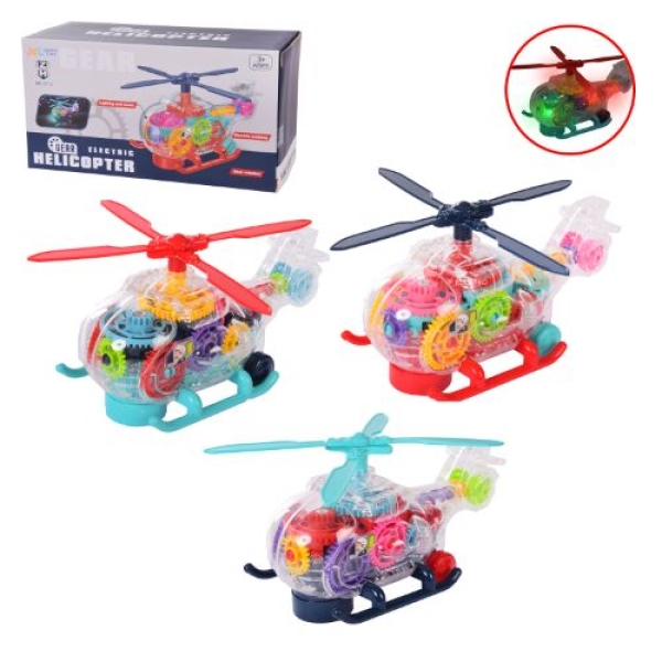 Незвичайний вертоліт має прозорий корпус, через який видно всі внутрішні деталі та шестерні. При русі весь процес заводиться і всі нутрощі вертольота починають обертатися. Також іграшка може самостійно пересуватися, обертатися пропелером та має світлові та звукові ефекти.