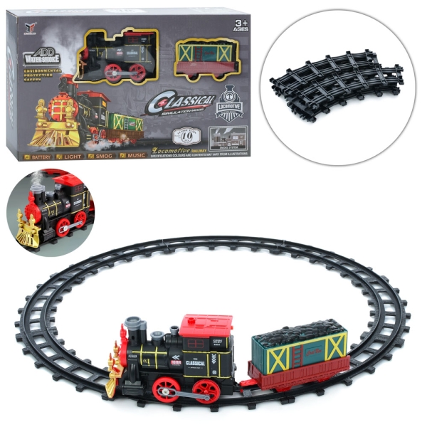 - Набір включає: 8 рейок, 1 локомотив, 1 товарний вагон